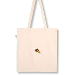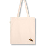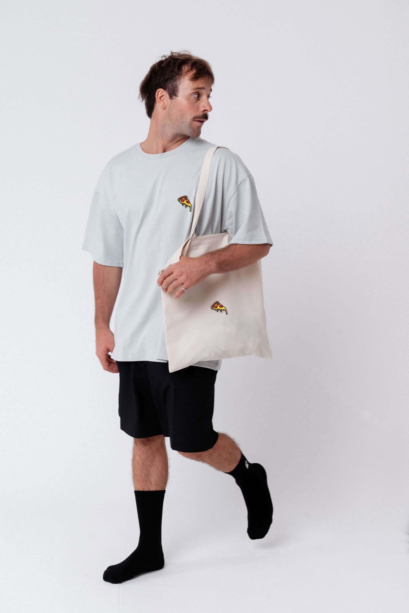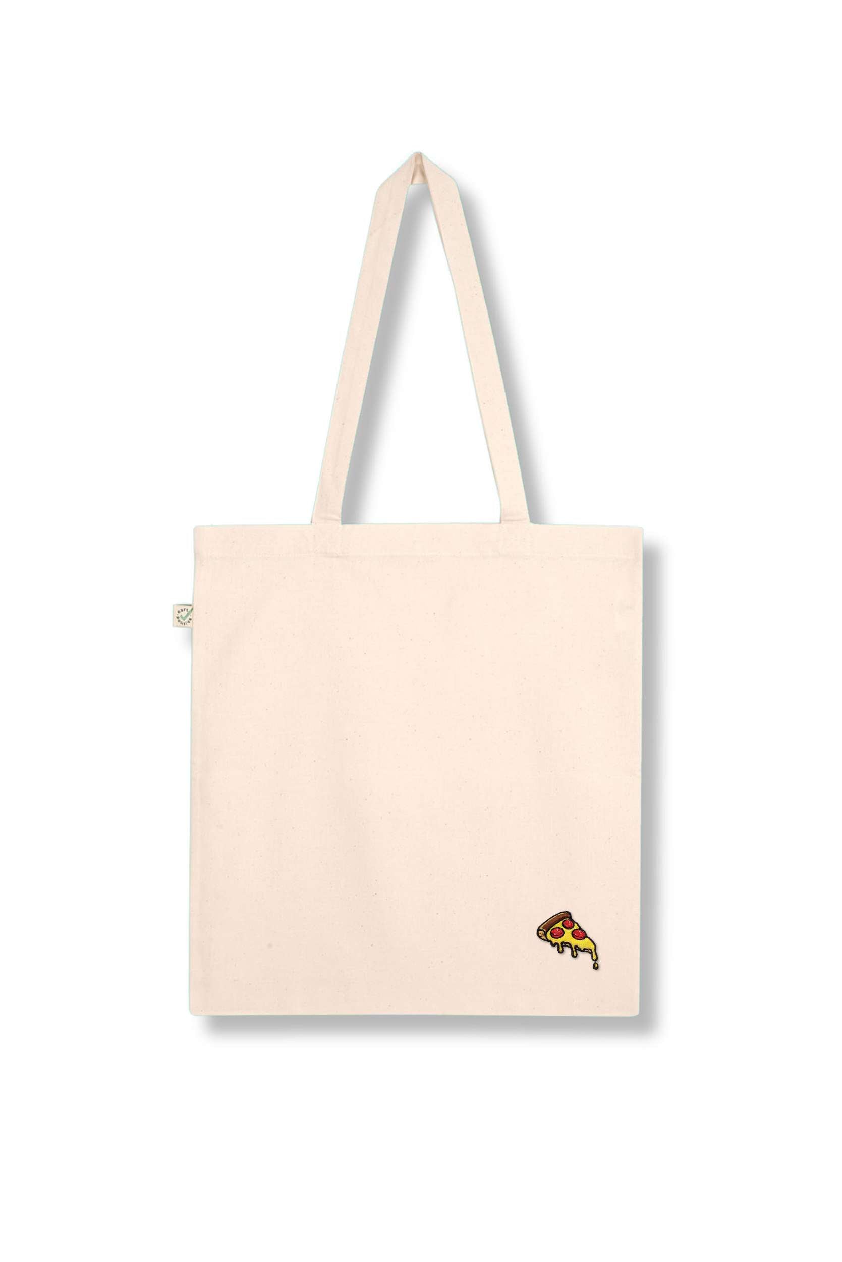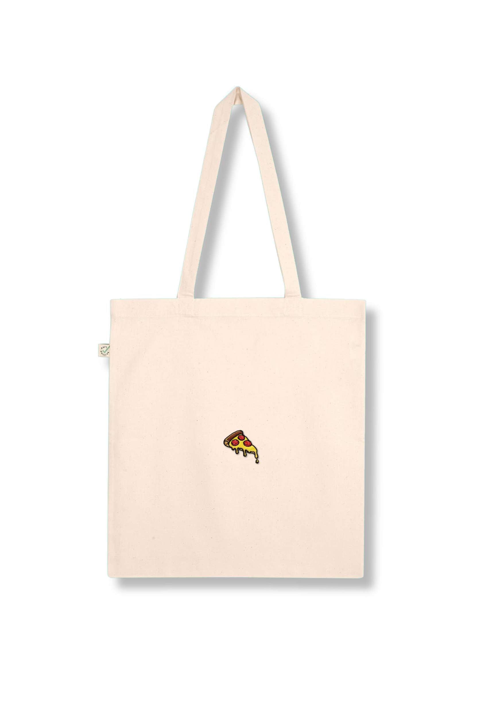 Bestickte, fair produzierte Bio-Baumwoll-Tragetasche im Pizza Design.