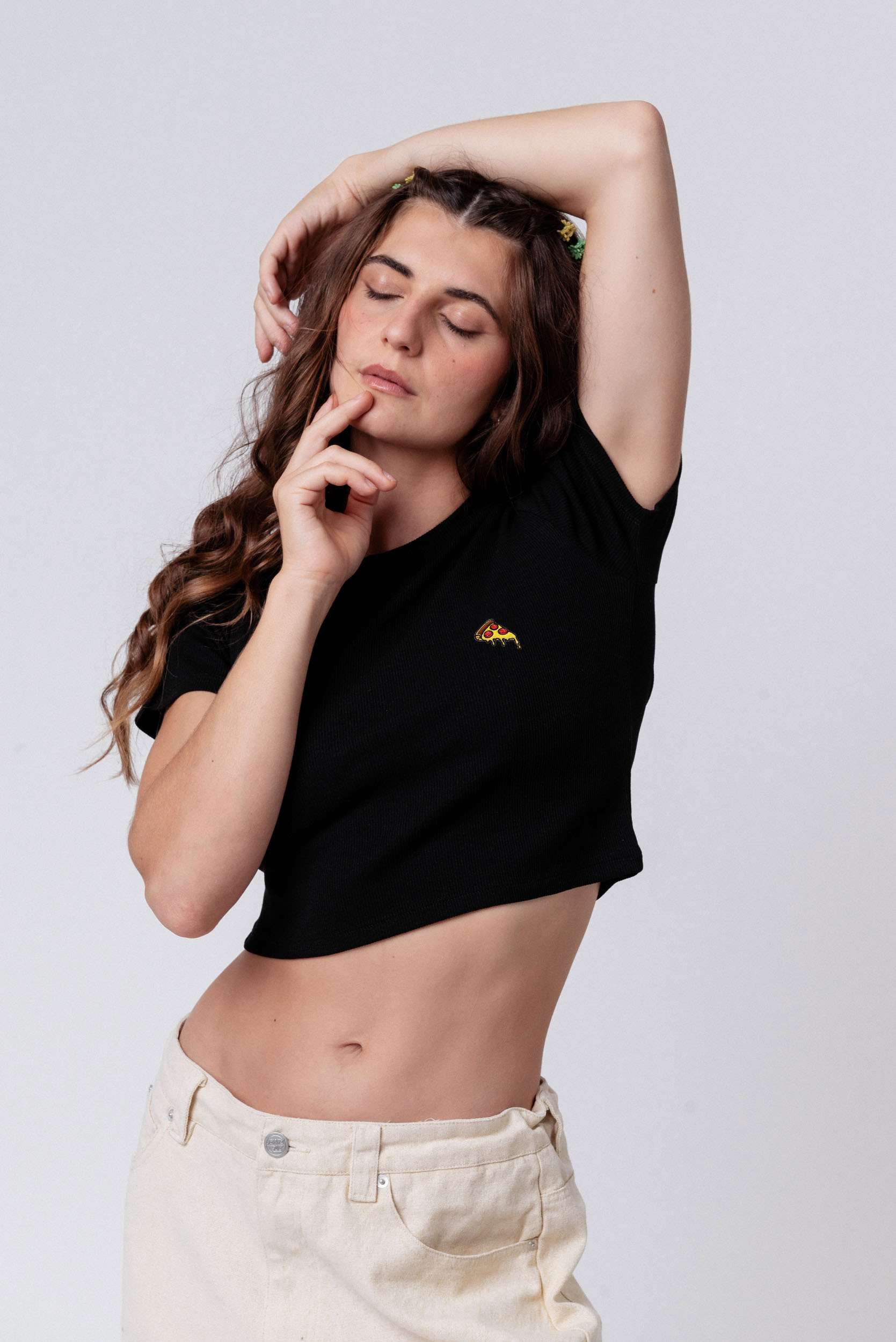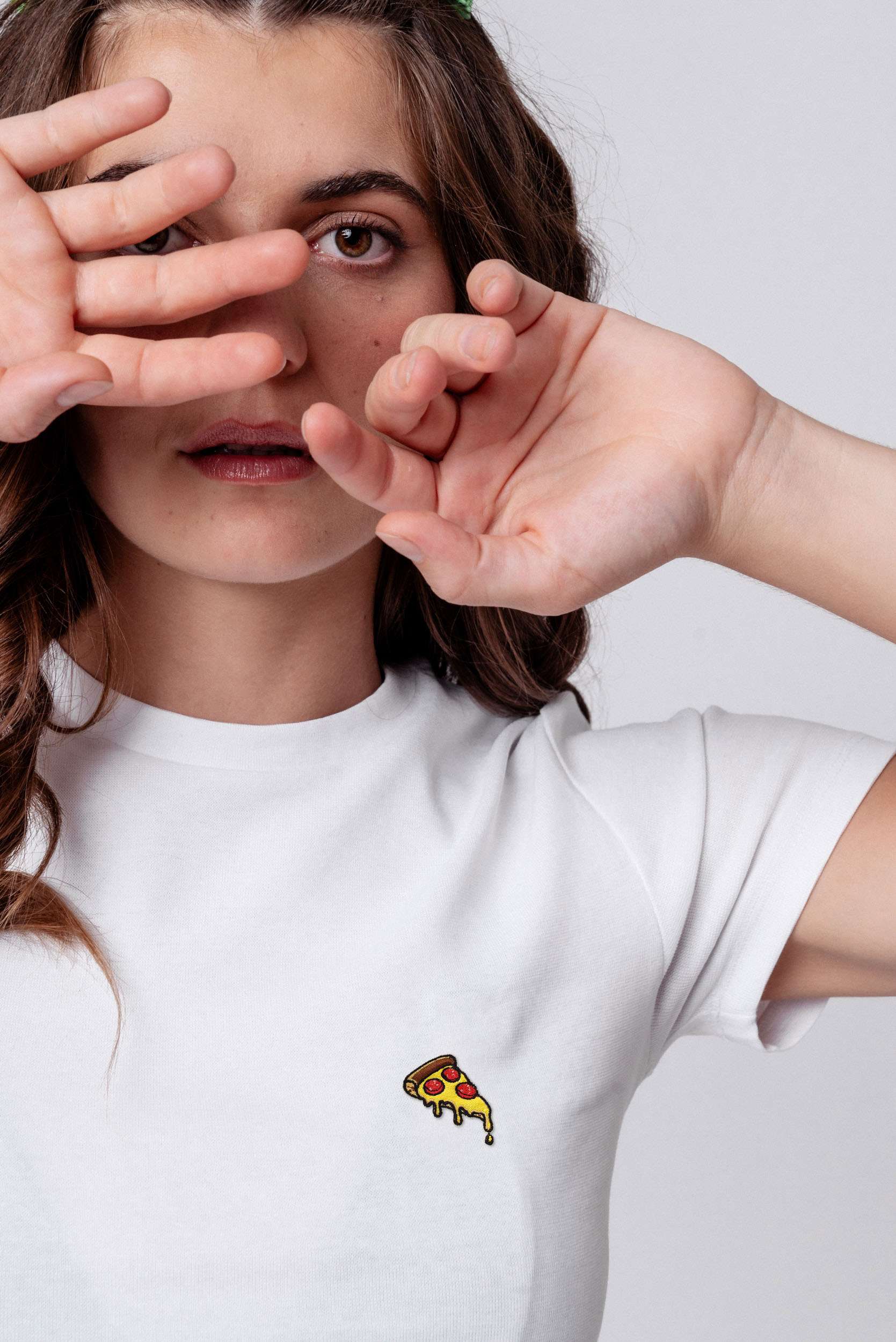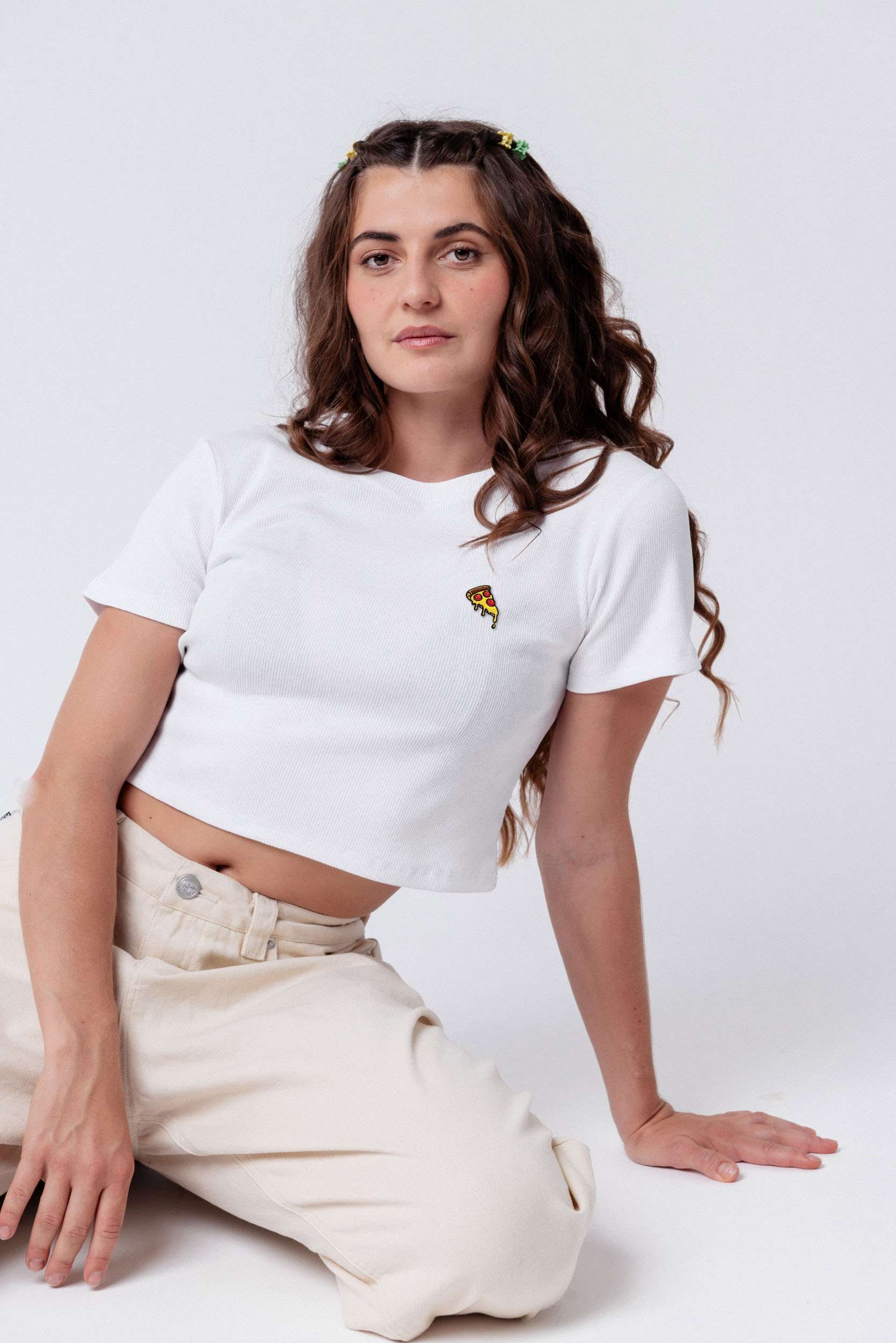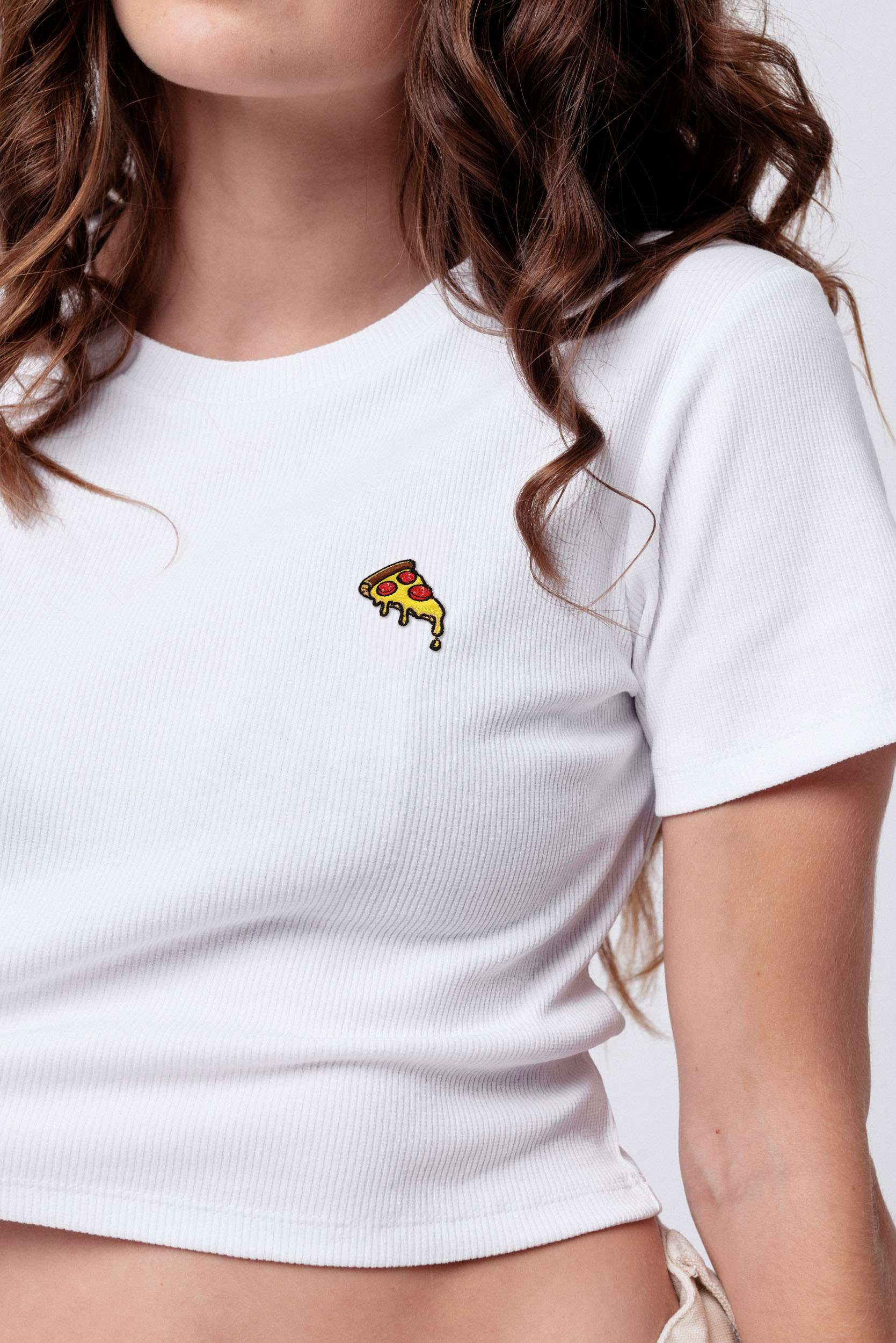 Super hochwertiges Bio Baumwoll Cropped T-Shirt mit gesticktem Pizza Design in drei verschiedenen Schnitt-Varianten: Ripped, Regular & Oversized
