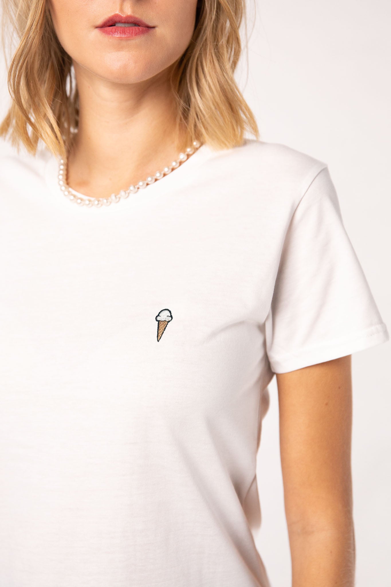 Besticktes Bio Baumwoll Frauen T-Shirt mit extrem angenehmen Stoff (155gsm) und gesticktem Eis Design - wähle deine Lieblingssorte: Schoki, Erdbeere oder Vanille 🍦