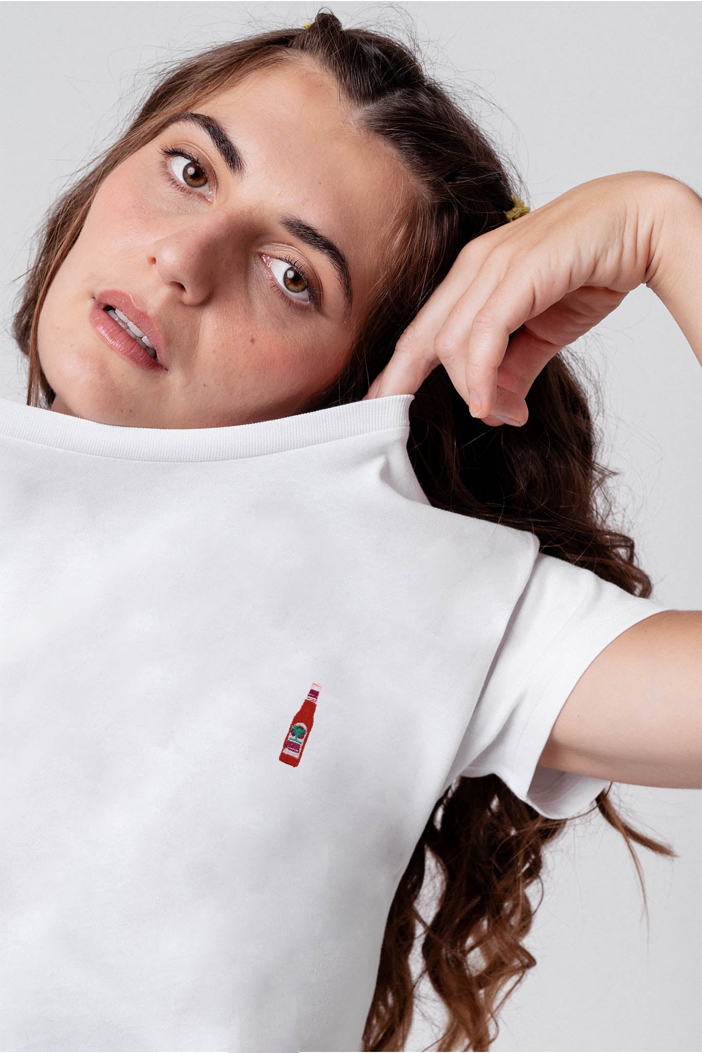 Super hoogwaardig biologisch katoenen dames T-shirt met uiterst comfortabele stof (155 gsm) en het officiële geborduurde Somersby Blackberry Fles