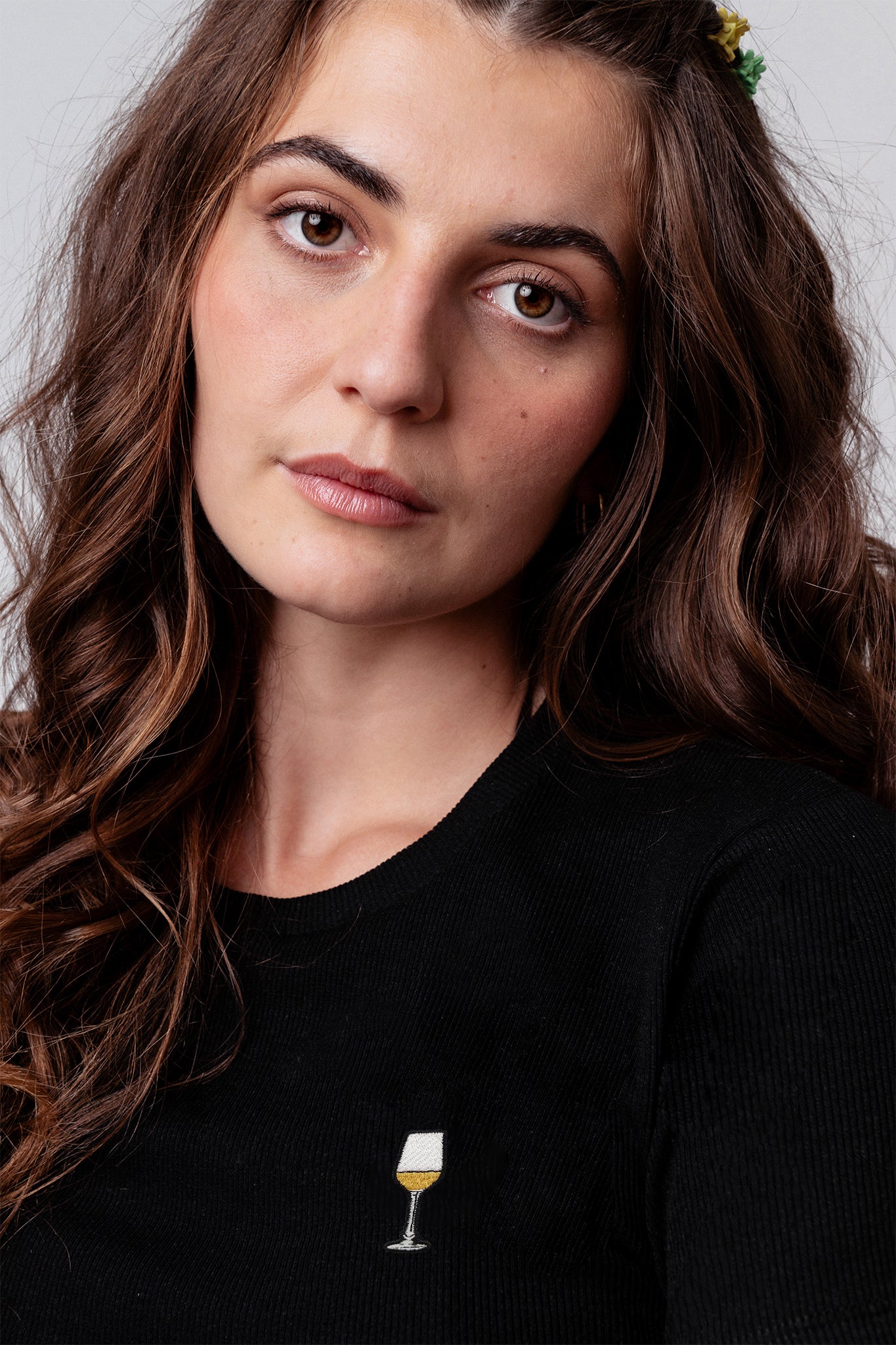 Super hochwertiges Bio Baumwoll Cropped T-Shirt mit gesticktem Weißwein Design in drei verschiedenen Schnitt-Varianten: Ripped, Regular & Oversized