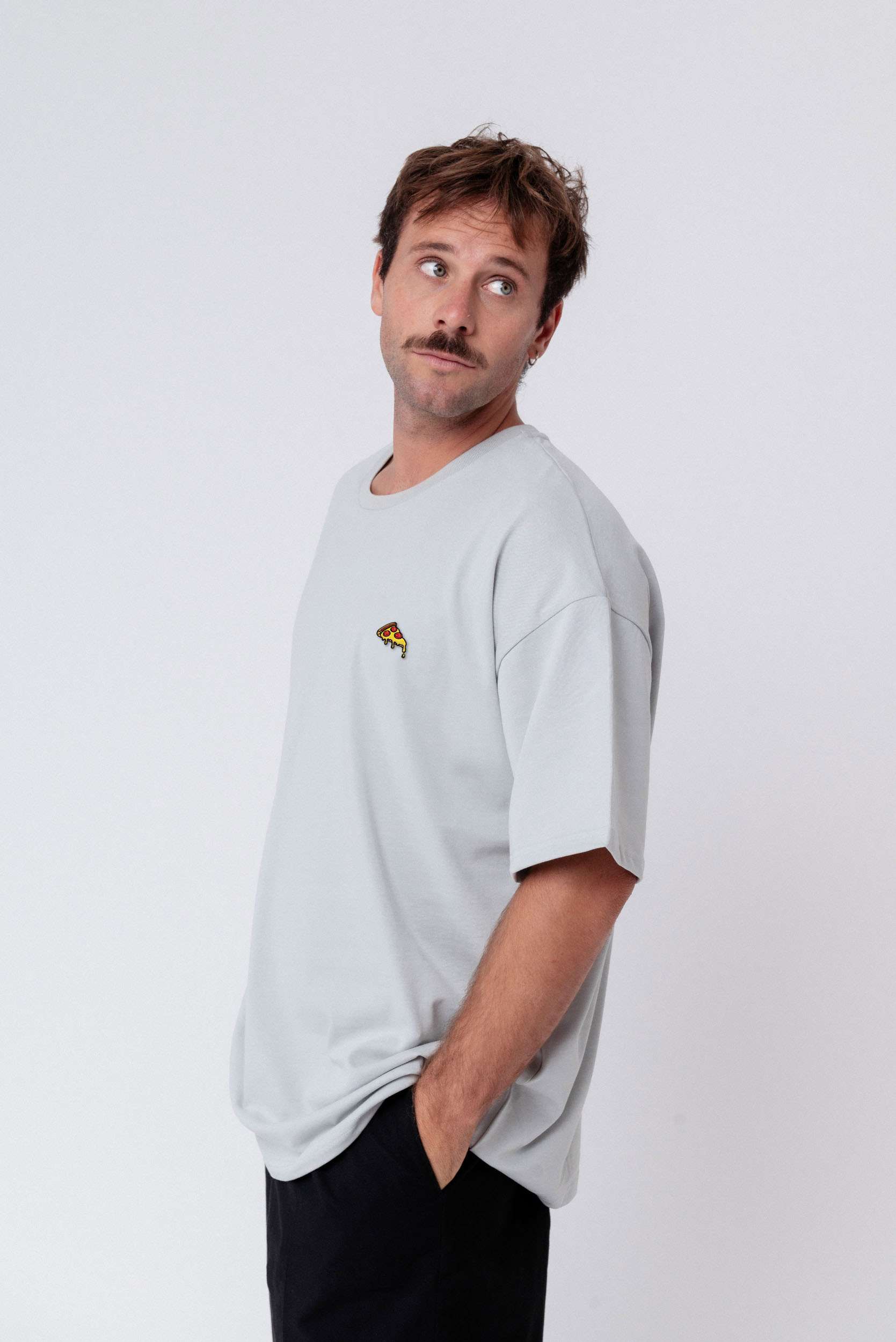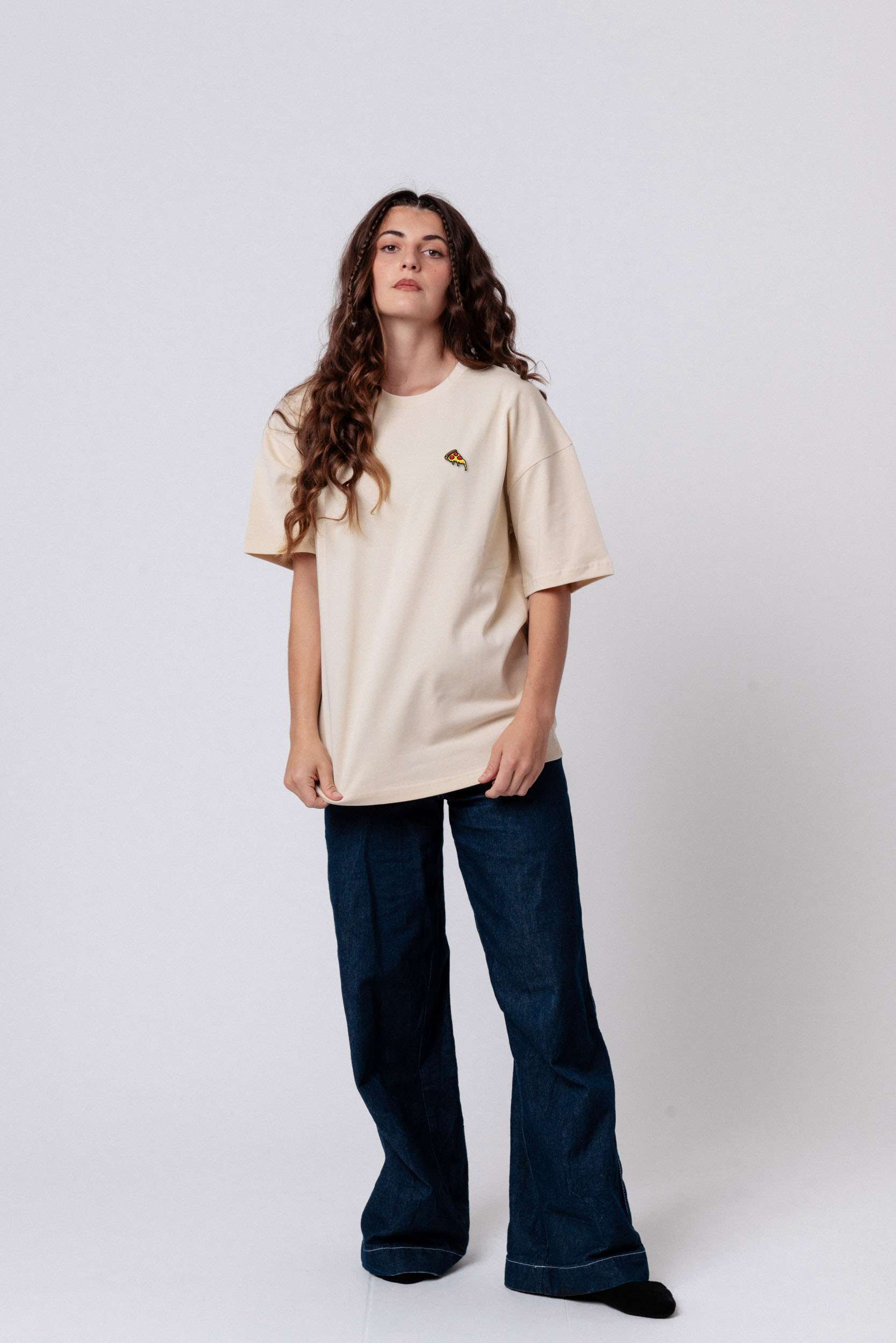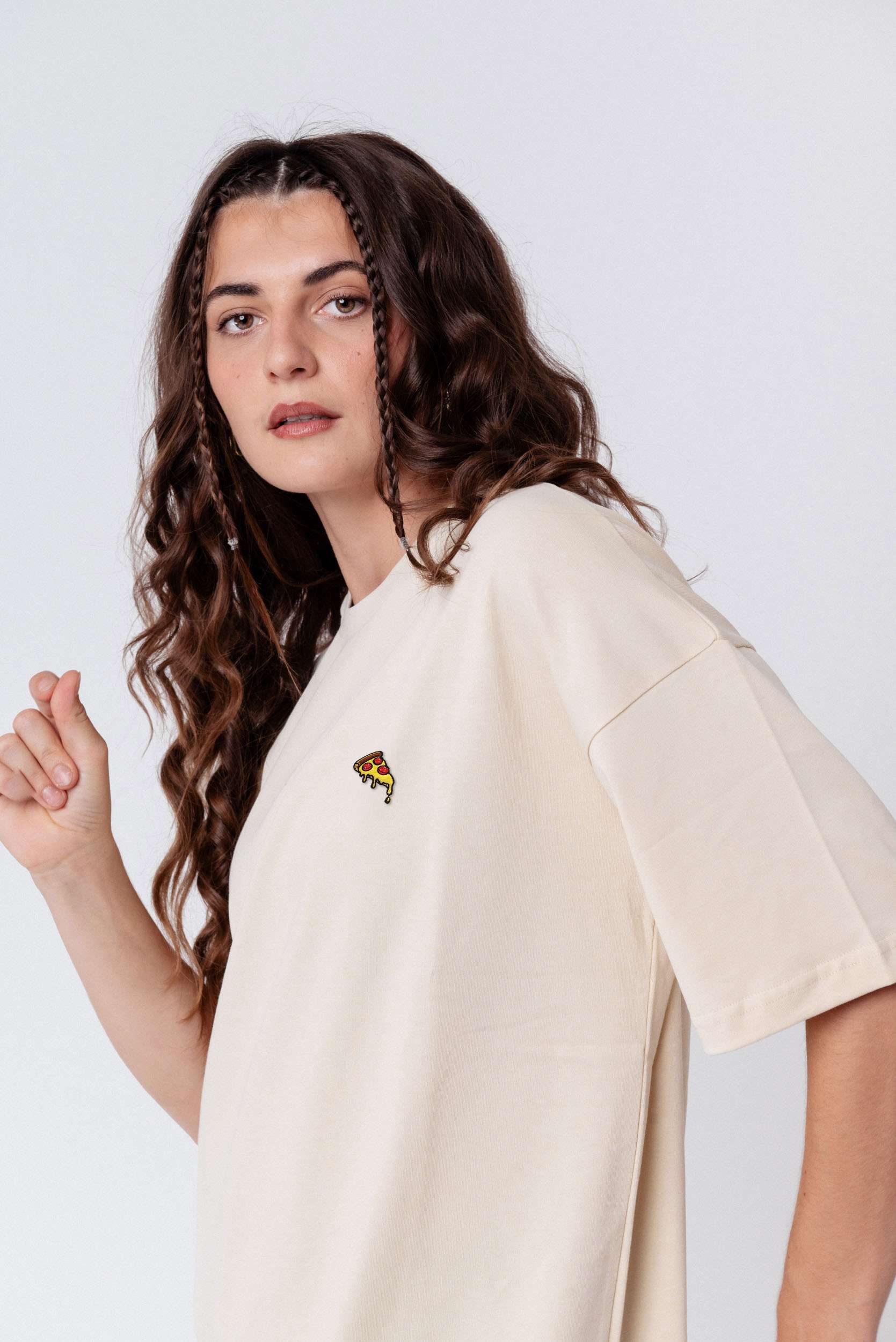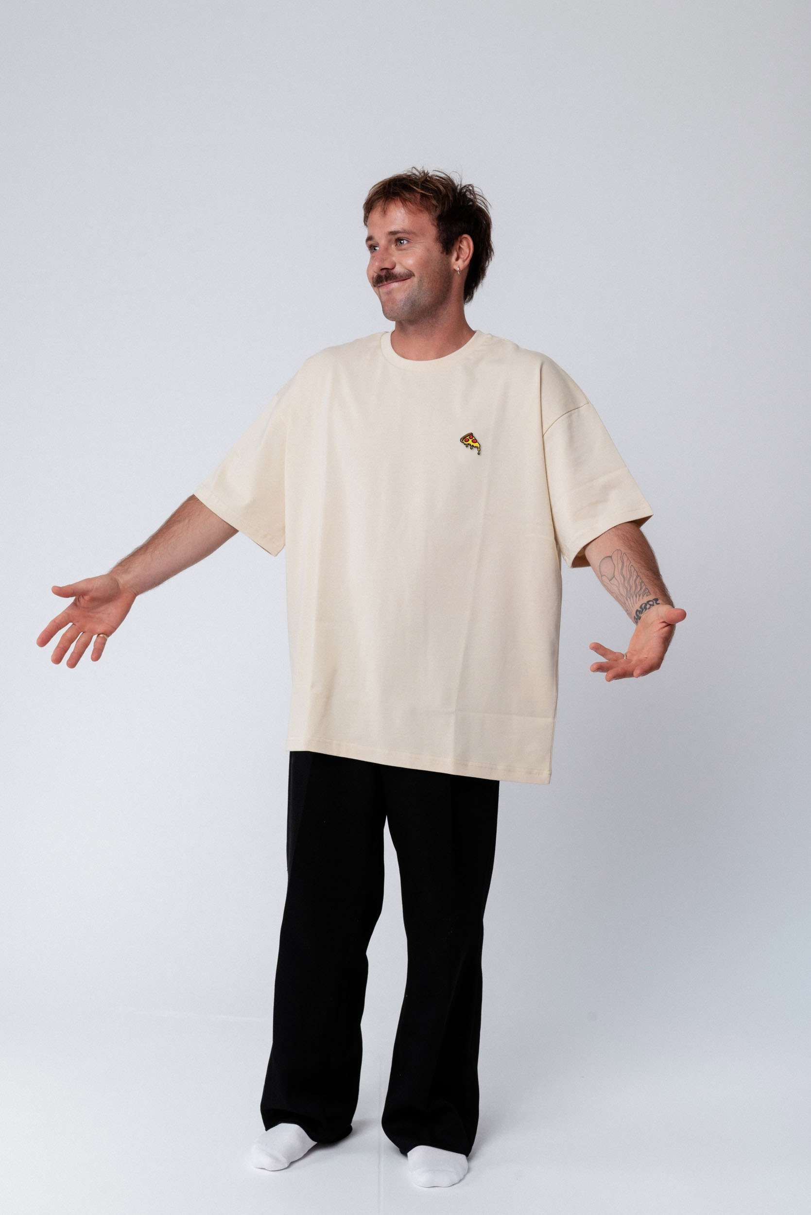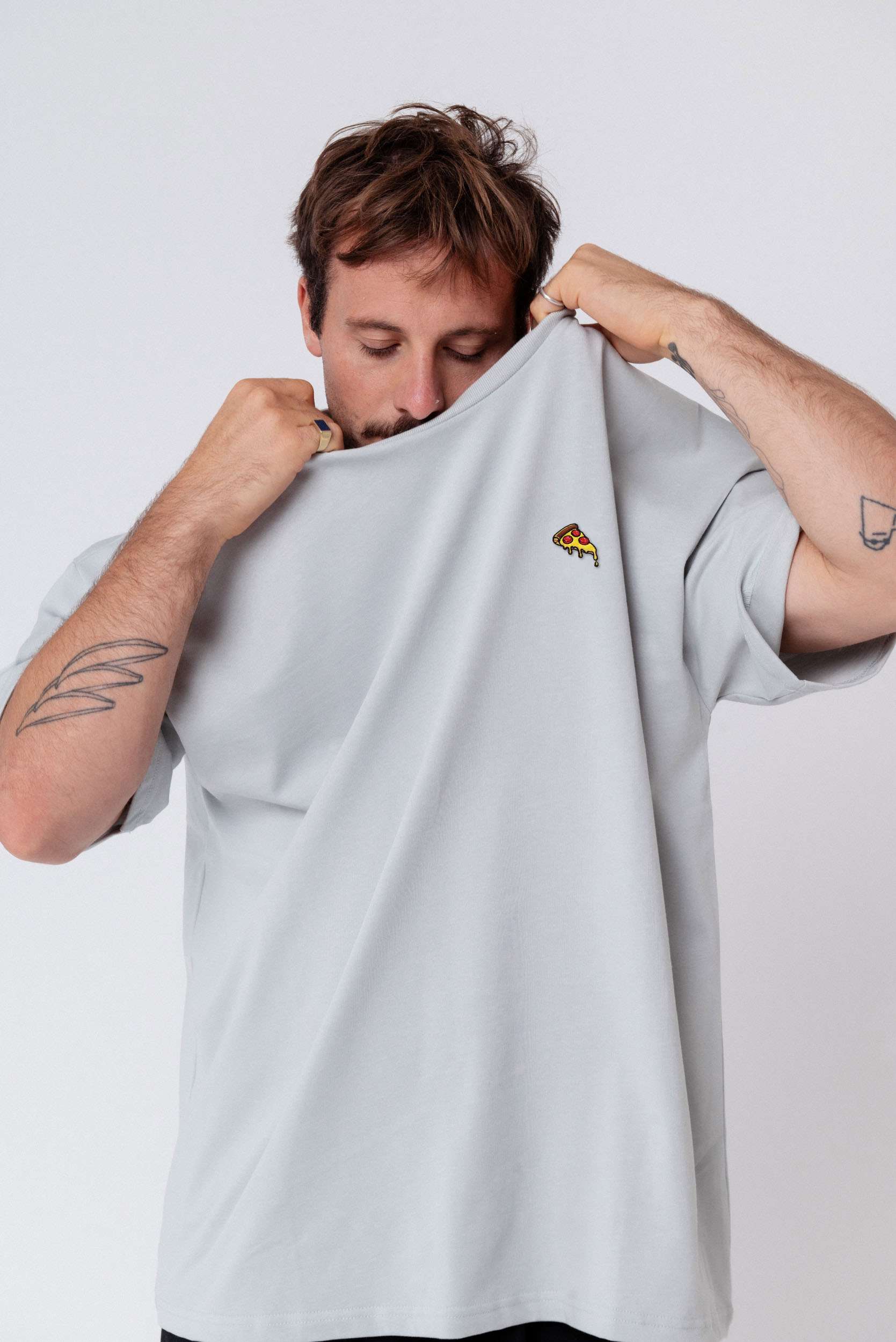 Heavy Oversized Bio Baumwoll T-Shirt mit extra schwerem Stoff (230gsm) und gesticktem Pizza Design