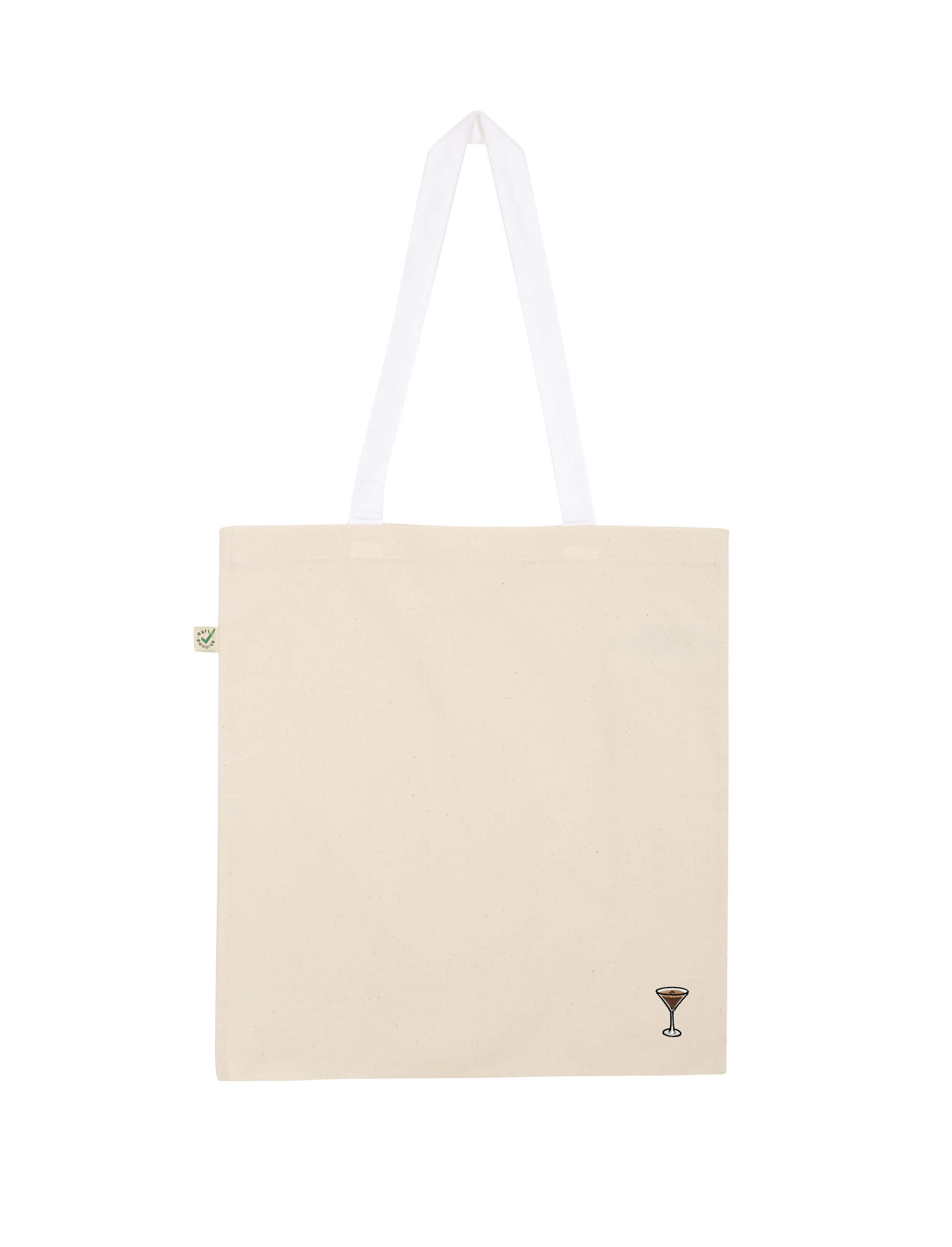 Geborduurde, eerlijk geproduceerde draagtas van biologisch katoen in het ontwerp Espresso Martini.