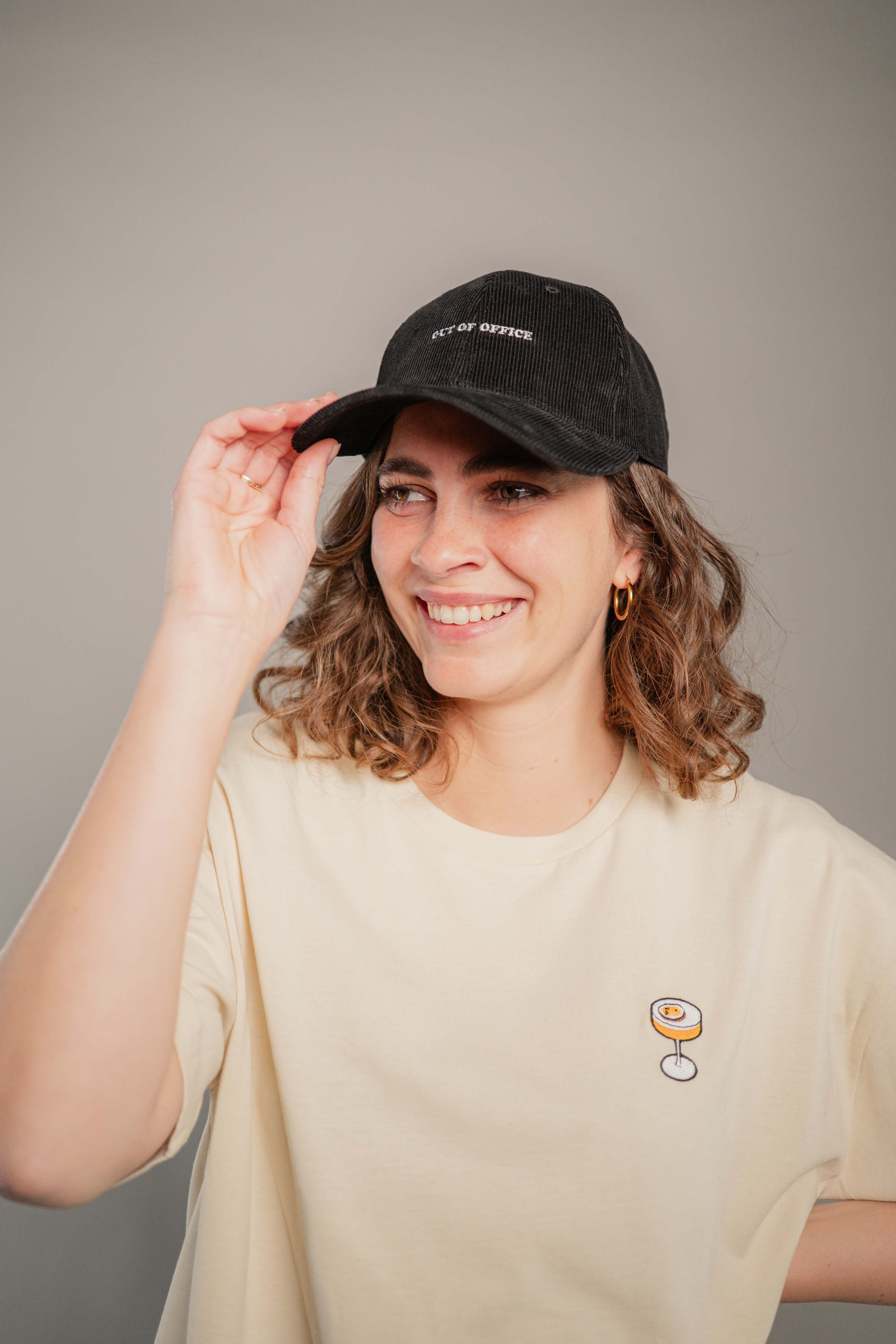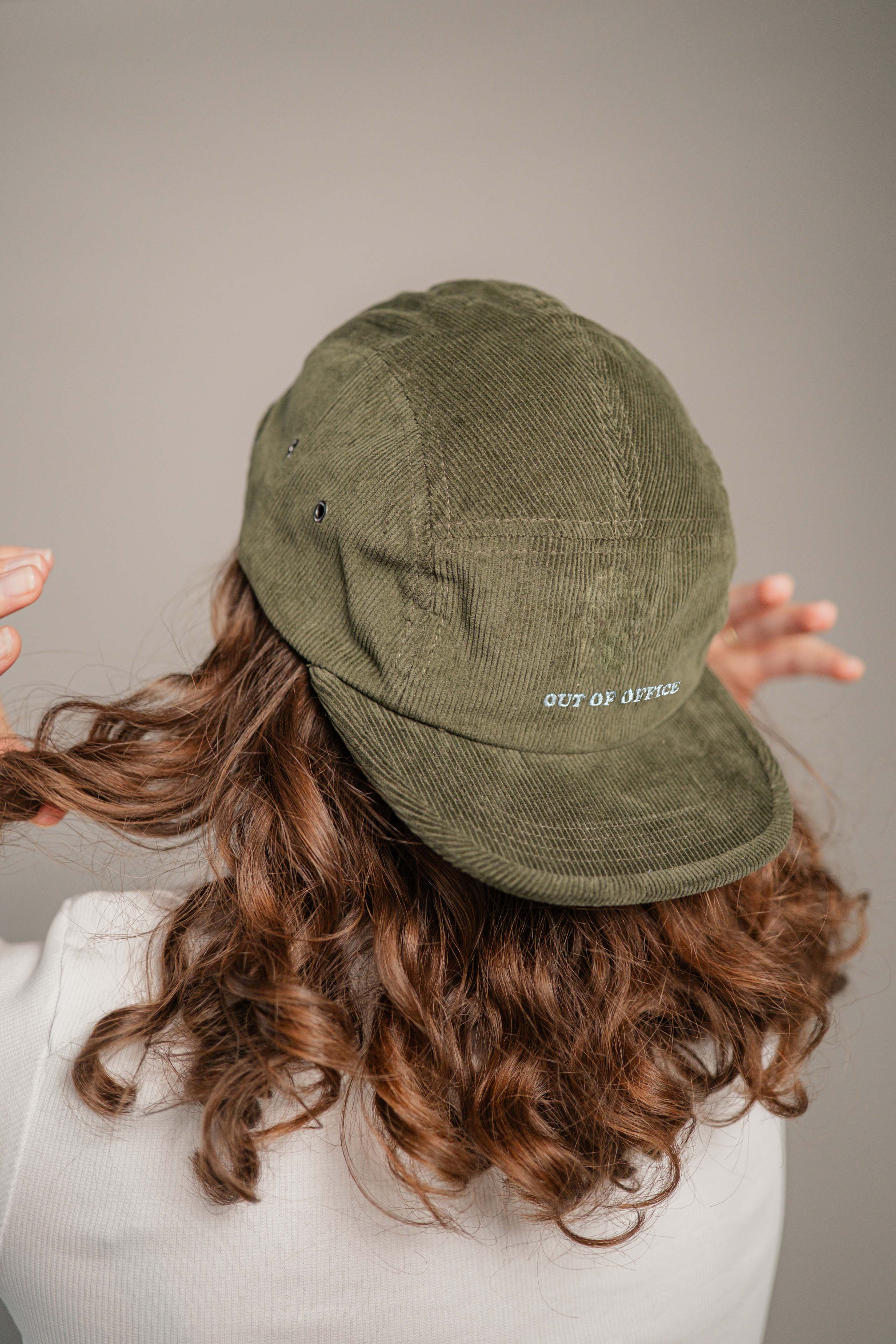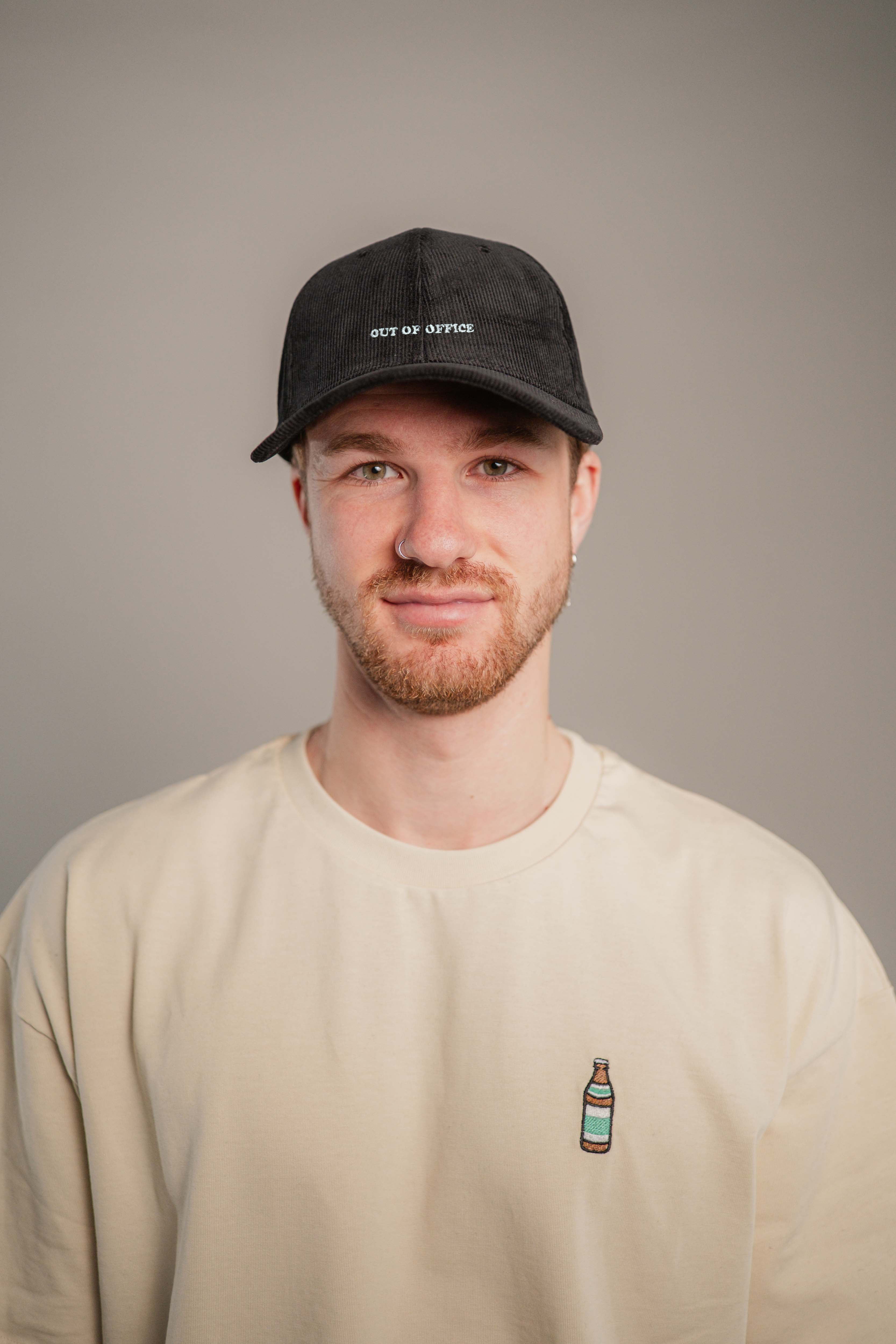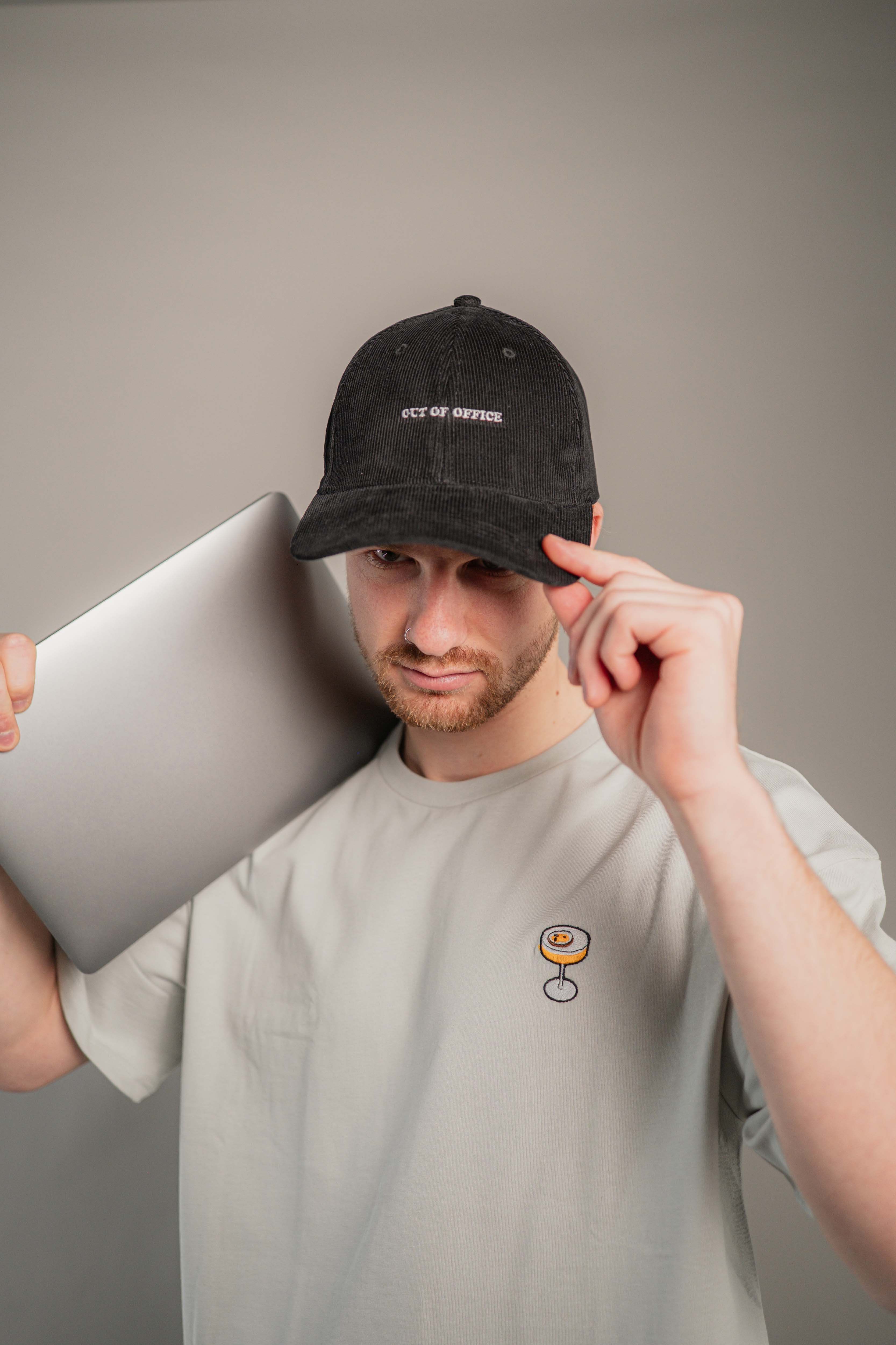Super hochwertige Cord Cap aus 100% Bio Baumwolle mit gesticktem Out of Office Schriftzug vorne und kleinem gesticktem O.O.O. seitlich