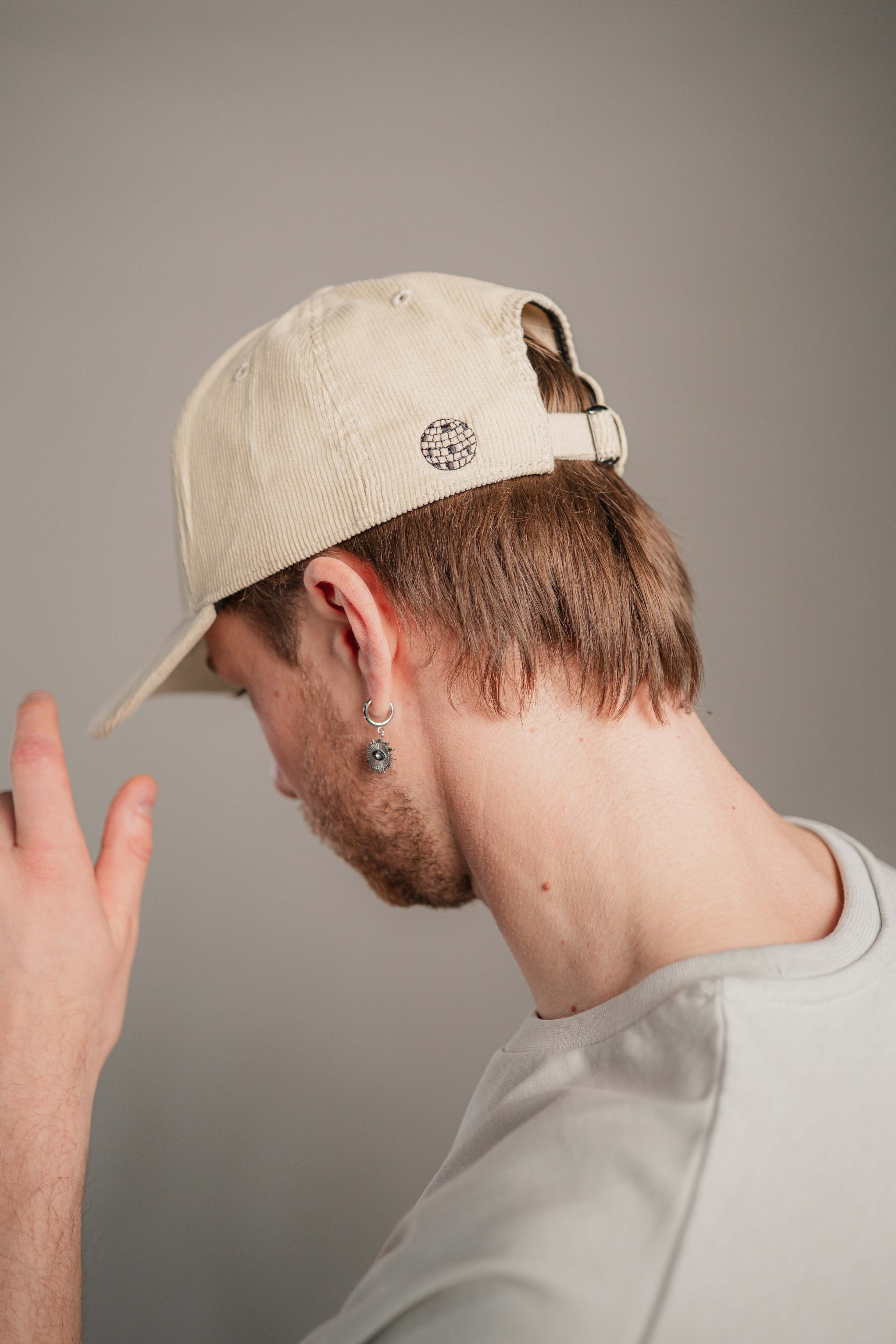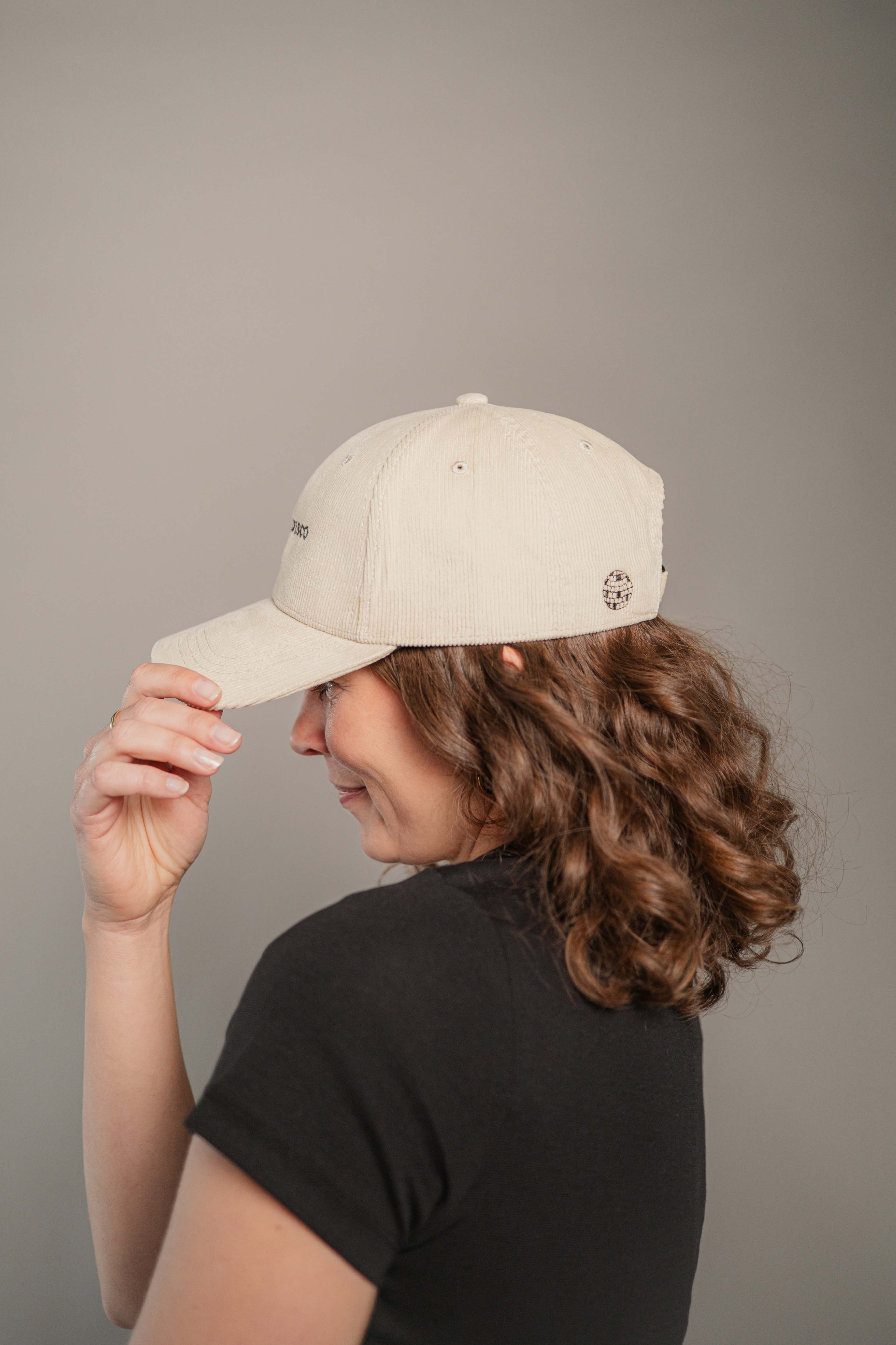 Super hochwertige Cord Cap aus 100% Bio Baumwolle mit gesticktem Very Disco Schriftzug vorne und kleiner gestickter Discokugel seitlich