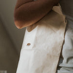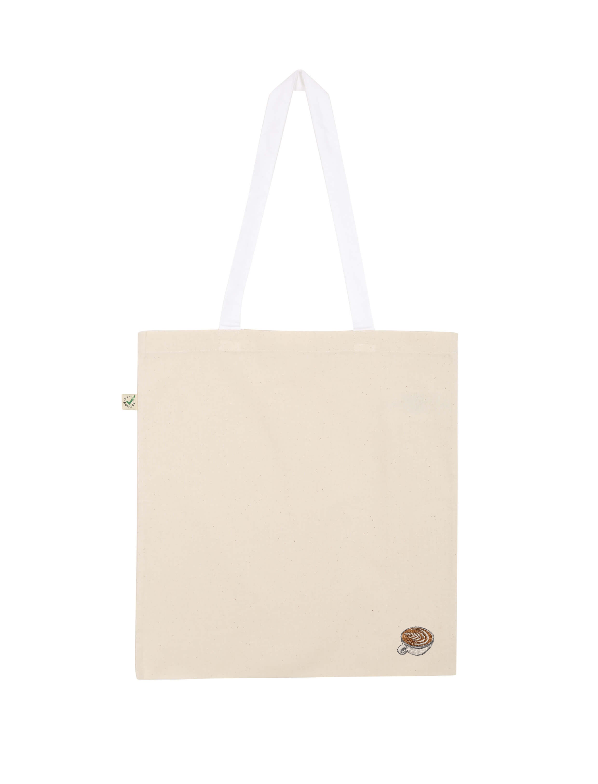 Bestickte, Fair produzierte Bio-Baumwoll-Tragetasche im Flat White Design.