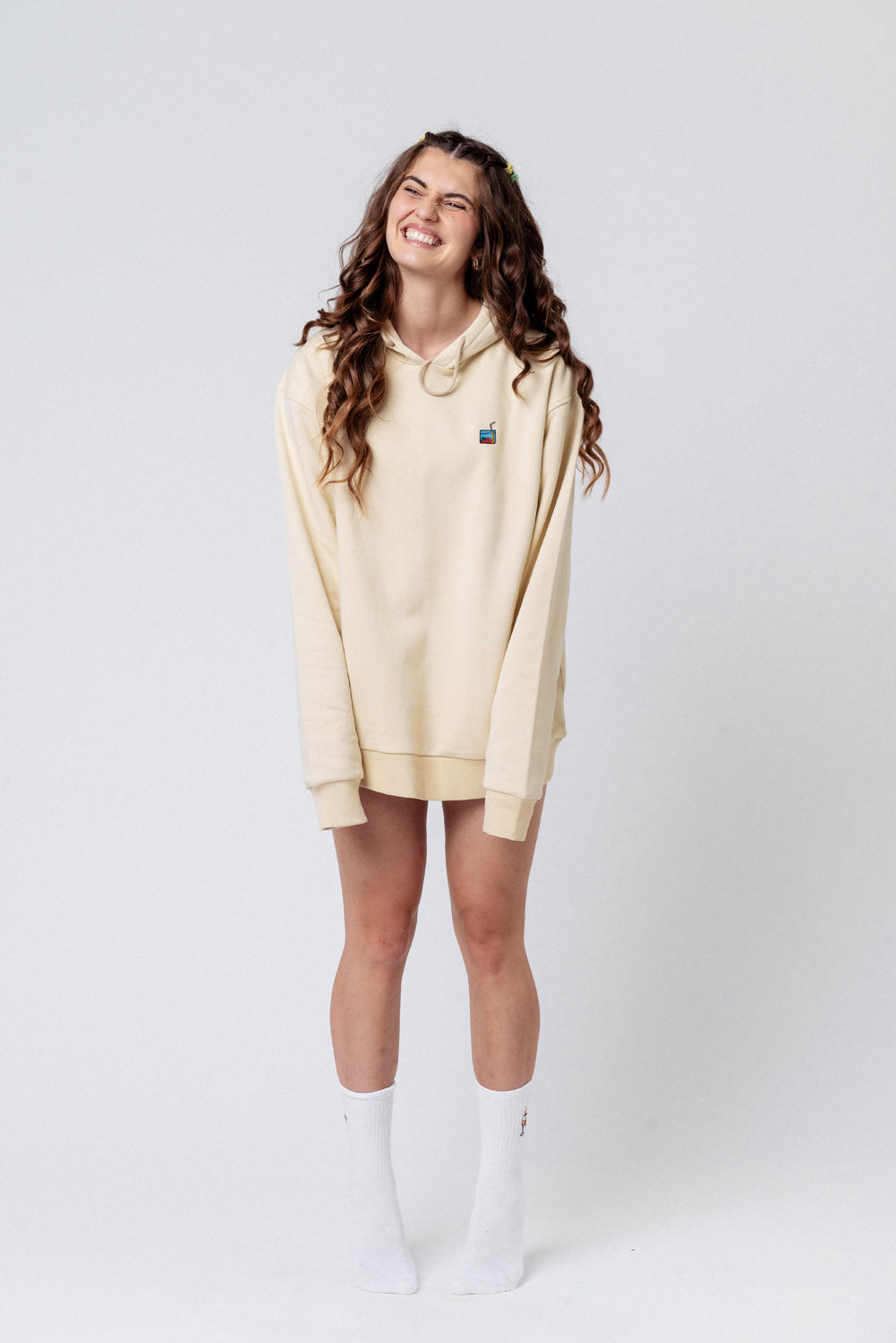Super hochwertiger Bio Baumwoll Unisex Hoodie mit schwerem Stoff (350gsm) und dem gestickten Pfirsich Eistee Design