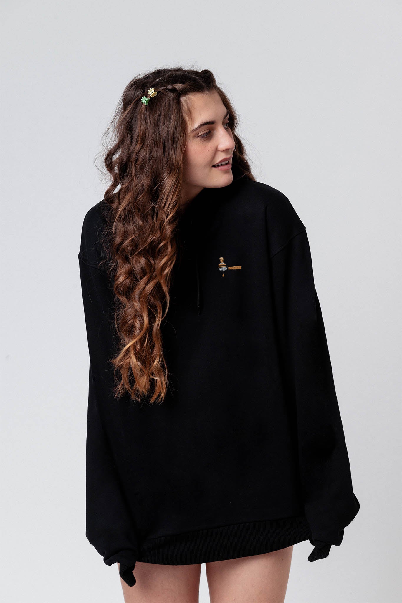 Super hochwertiger Bio Baumwoll Unisex Hoodie mit schwerem Stoff (350gsm) und gesticktem Siebträger & Tamper Design