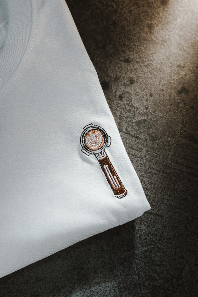 Super hochwertiges Bio Baumwoll Frauen T-Shirt mit extrem angenehmen Stoff (180gsm) und gesticktem Siebträger Latte Art Design