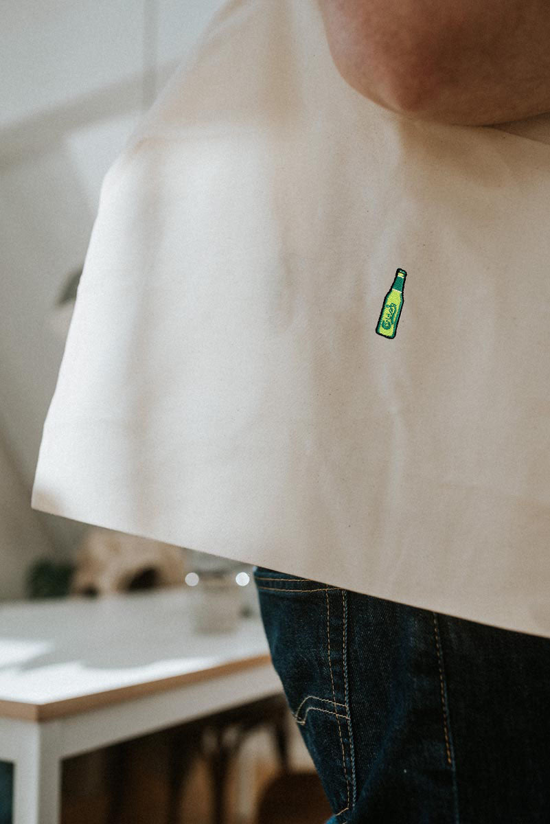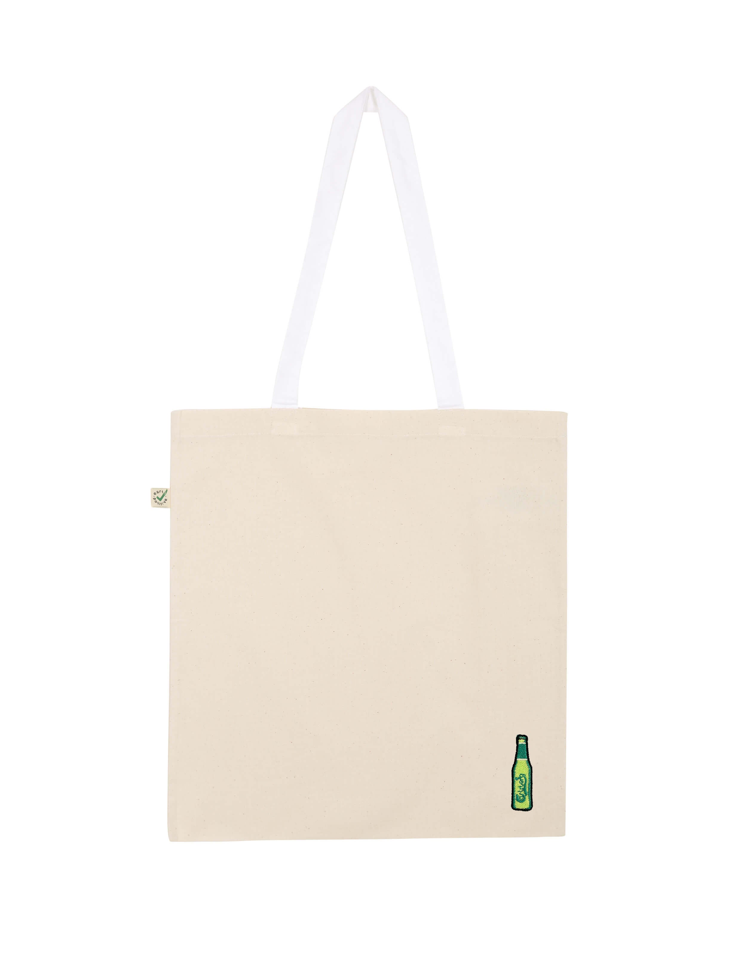 Geborduurde, eerlijk geproduceerde draagtas van biologisch katoen in Carlsberg-design.