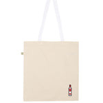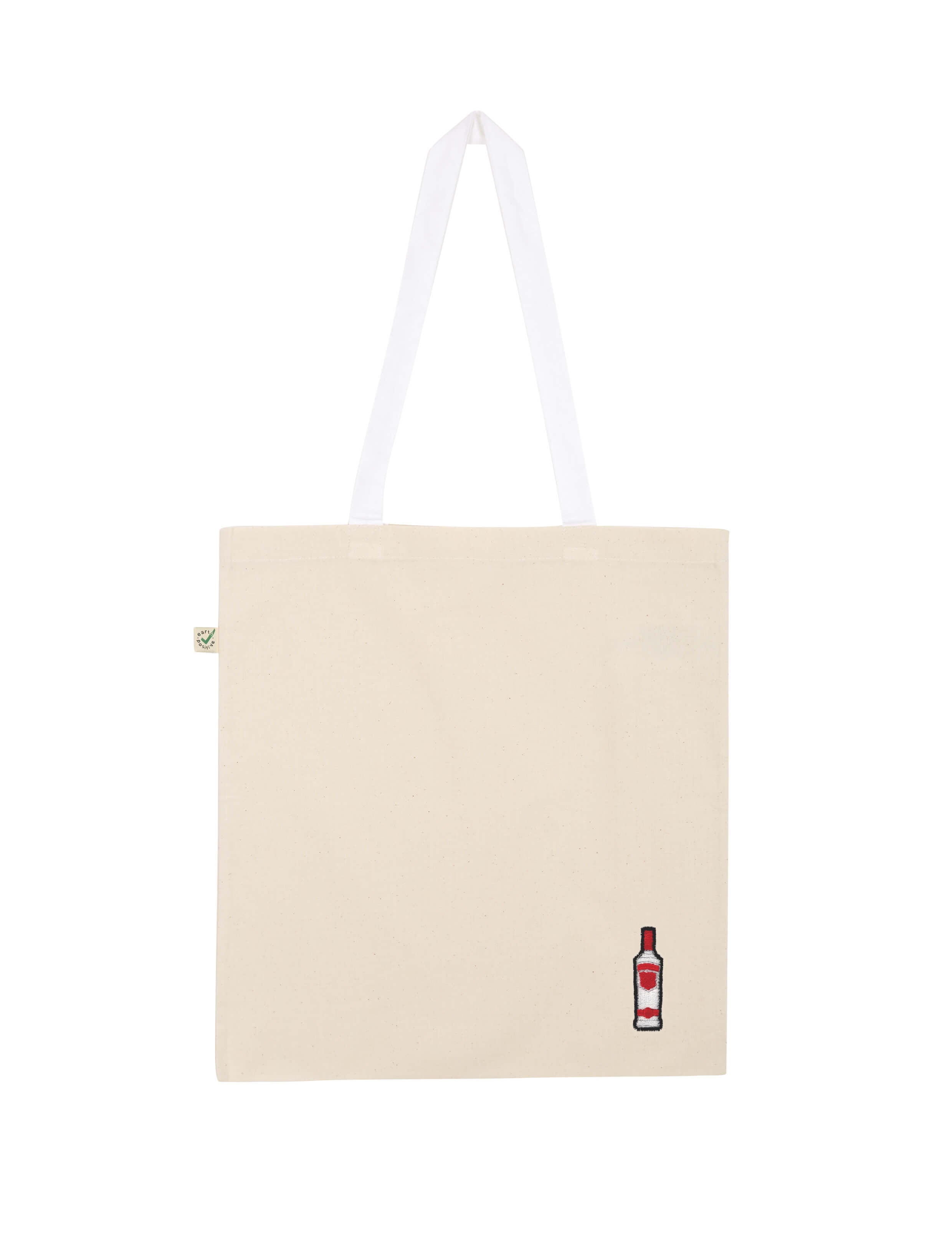 Geborduurde, eerlijk geproduceerde draagtas van biologisch katoen in een wodka-dessin.