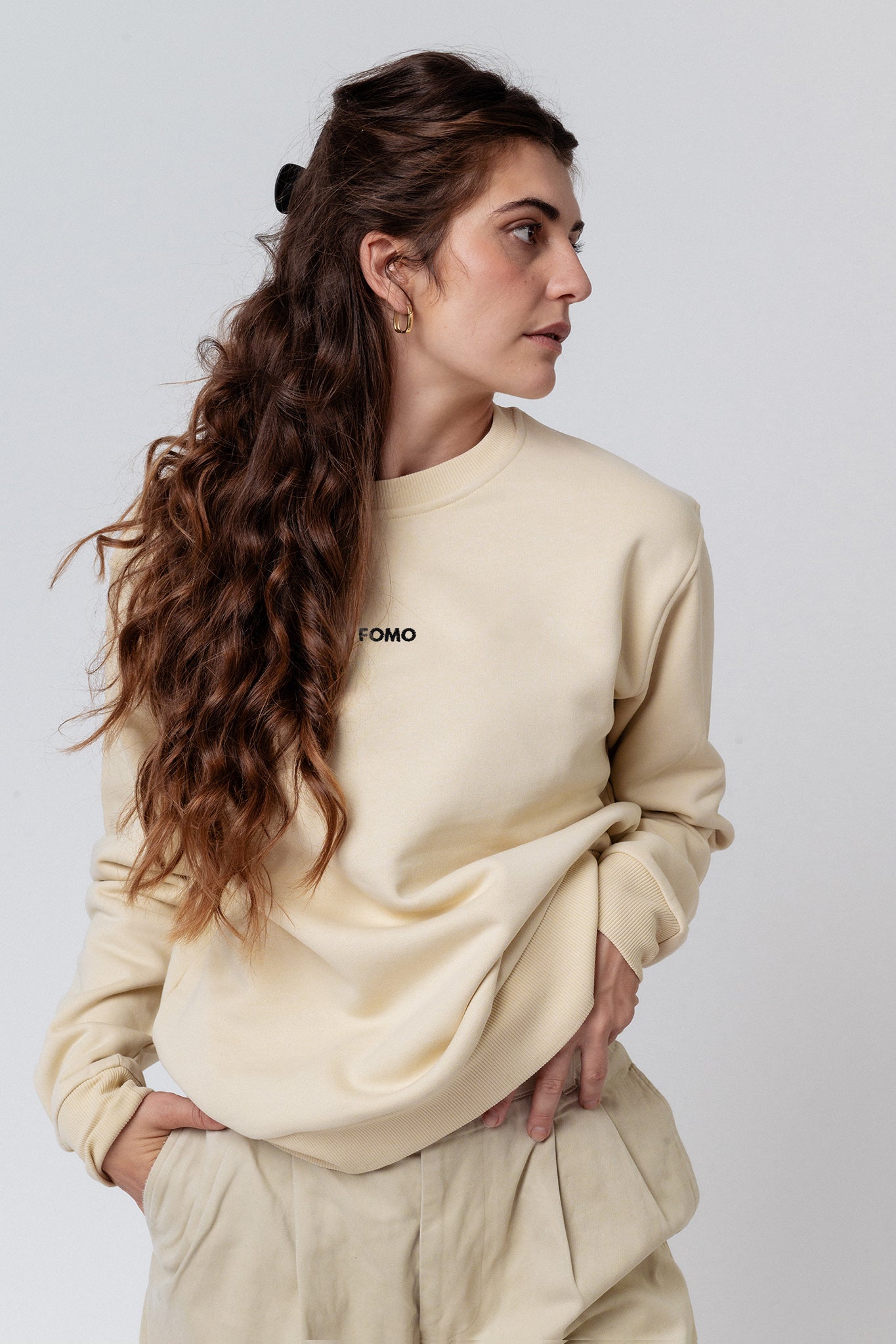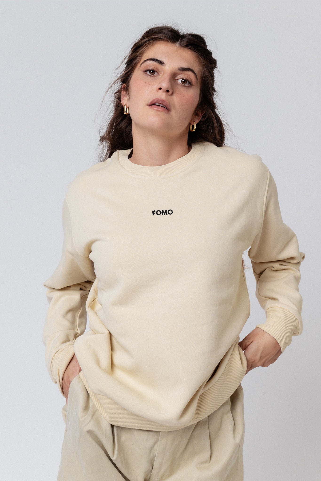 Bestickter Bio Baumwoll Unisex Pullover mit schwerem Stoff (320gsm) und gesticktem FOMO (Fear of missing out) Belettering