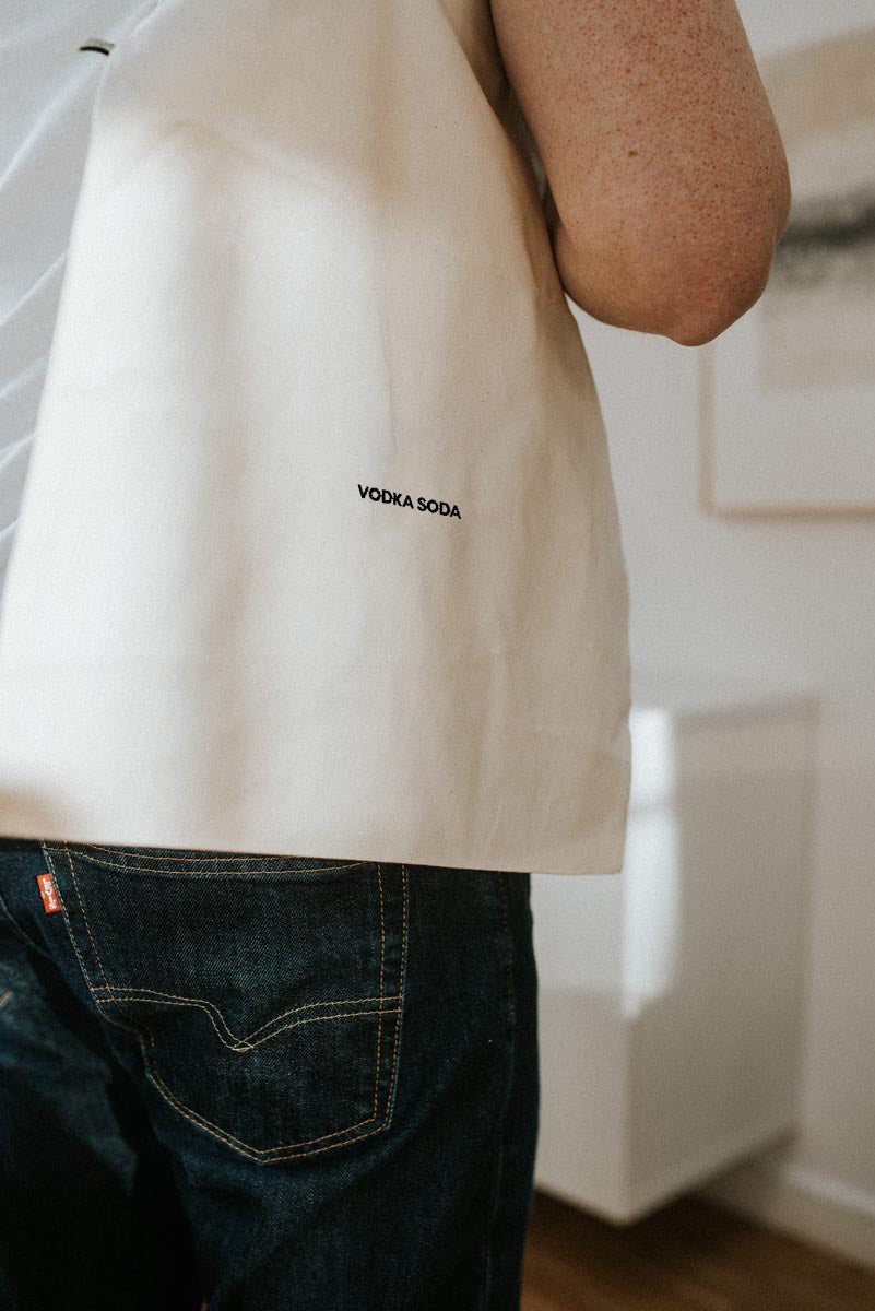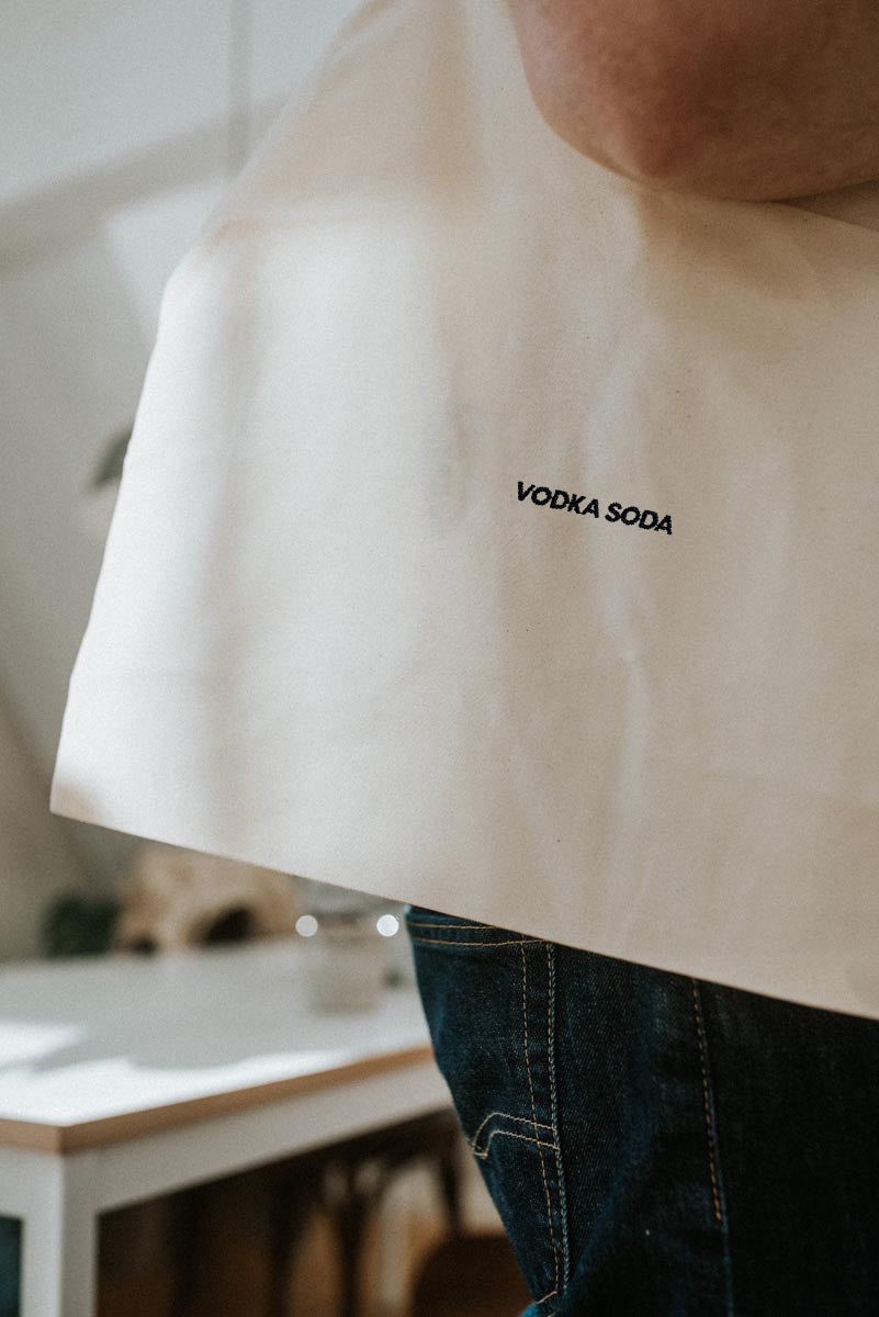 Geborduurde, eerlijk geproduceerde draagtas van biologisch katoen met het opschrift VODKA SODA.