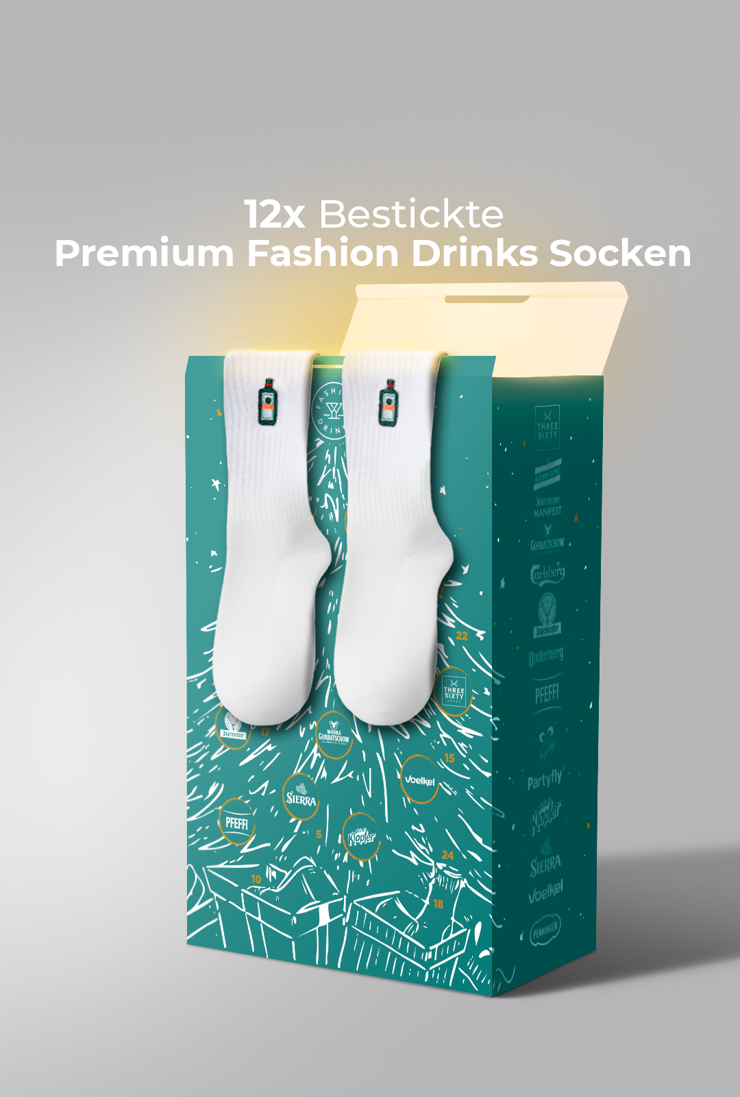 12x bestickte Fashion Drinks Socken + 15x Premium-Drinks & Gadgets im Wert von 280 € – jetzt für nur 149 €.